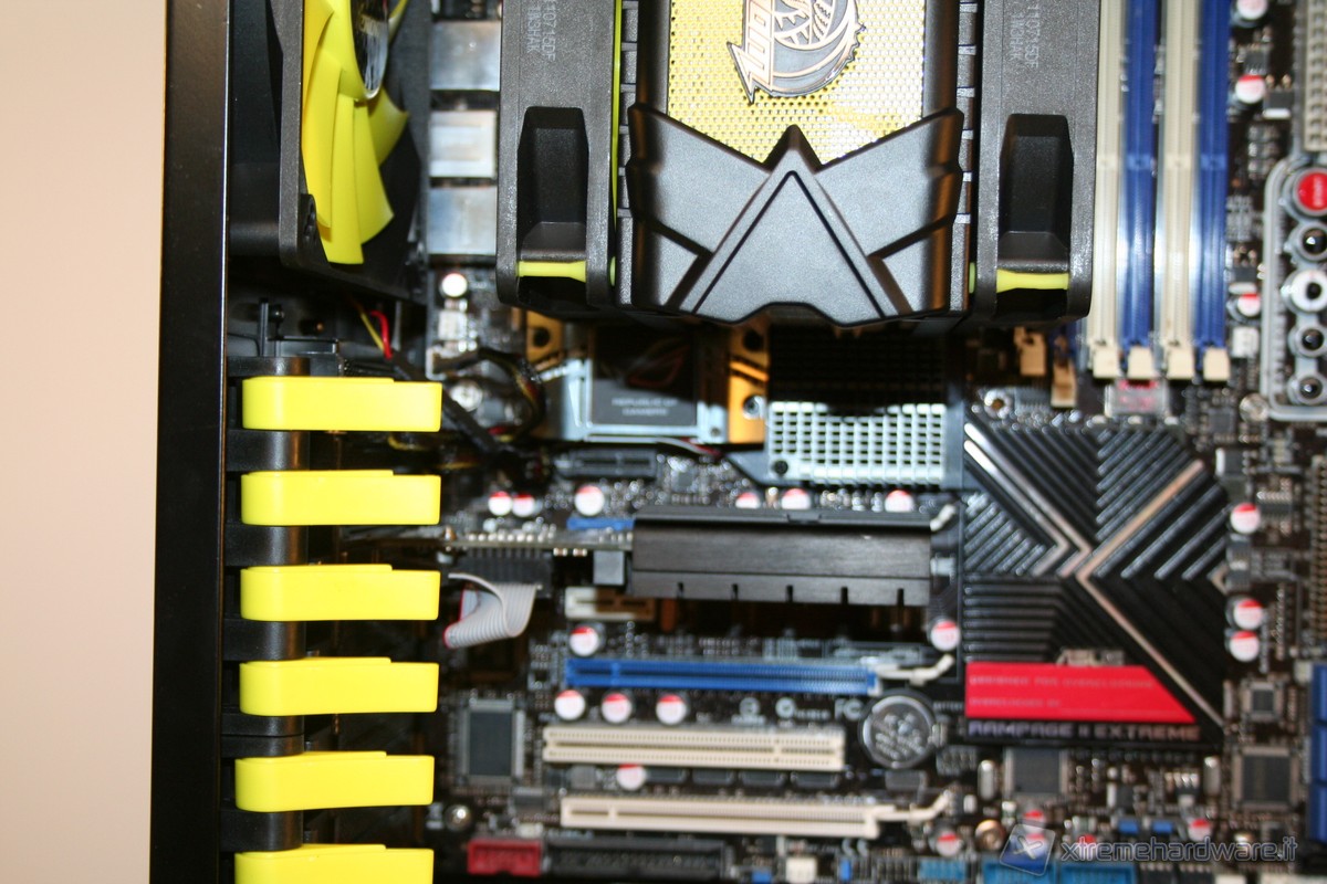 In un case di dimensioni molto generose come questo, la zona intorno al socket della CPU è molto grande; oltre a ciò sarà possibile montare un radiatore da 240mm in posizione superiore, oppure un radiatore da 120mm con spessore doppio.